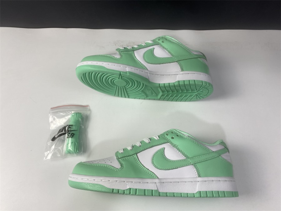 The Nike women’s Dunk Low ‘Green Glow’ showcases traditional color blocking on a customary all-leather build. A crisp white base is contrasted by a vibrant shade of green on the sneaker’s eyestay, Swoosh, and forefoot and heel overlays. The verdant hue is repeated on the woven tongue tag and heel tab, both marked with standard Nike branding. The low-top rides on a two-tone rubber cupsole, equipped with a grippy outsole originally designed for pivoting on the hardwood.